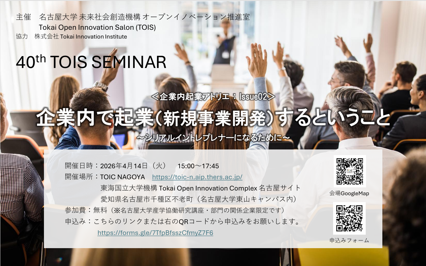 2026/03/2540th TOIS SEMINAR 企業内で起業(新規事業開発)するということ 2026年4月14日開催「経験者の生の声を聴く!」講演会&懇親会 「新規事業を創出せよ」と言われてから、どれくらいの時間がた... -