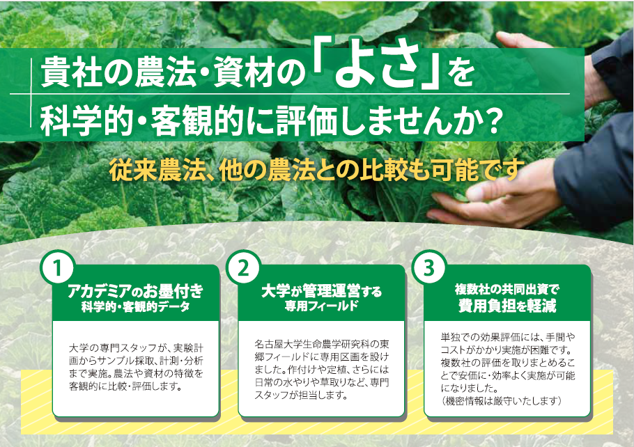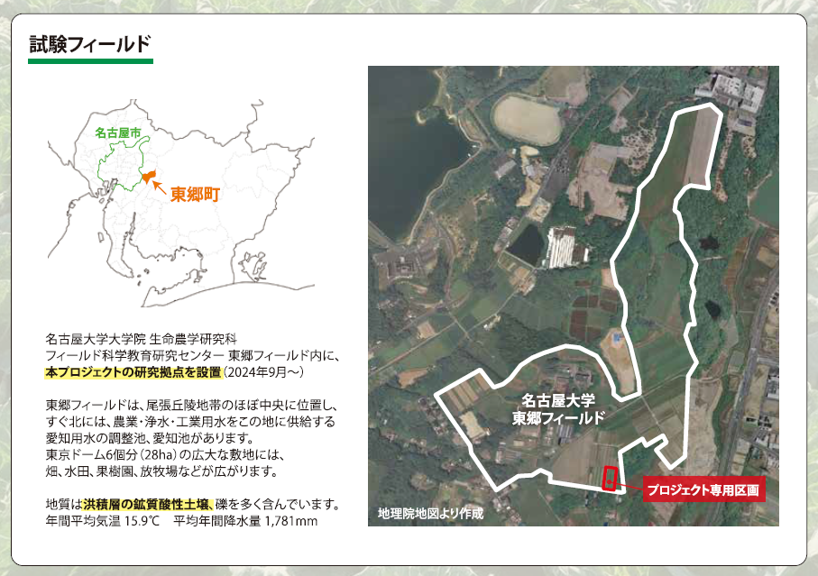 TIIの実験農場@名古屋大学東郷フィールド フィールドの概要 試験区画 試験内容の例 最新情報 2025.10.3. 東郷フィールドA区画 B区画 C区画 2025.9.12. 東郷フィールドA区画 B区画 C区画 2024.11.15. 東郷フィールド不織布トンネル掛けをした中には、小松菜を植えています。 モニタリングデータ 準備中です